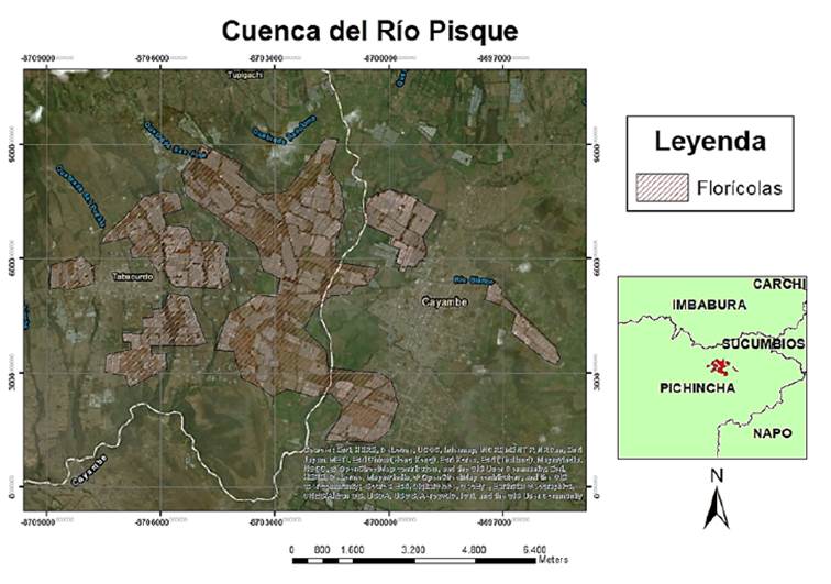 La cuenca del río Pisque es un valle en el cual se encuentran dos ciudades principales, Cayambe y Tabacundo, las cuales sumaron una población de 152 153 habitantes para el año 2018 (GAD Municipal de Pedro Moncayo, 2018; GADIP Cayambe, 2020), además de contar con 3 201,73 hectáreas de flores cultivadas en invernadero para el año 2017 (Cachipuendo, 2018). Se encuentra ubicada en la provincia de Pichincha y sus aguas desembocan en el río Guayllabamba, que posteriormente desemboca en el río Esmeraldas y en el océano Pacífico. Los invernaderos dedicados a la producción florícola acentuados entre las ciudades de Cayambe y Tabacundo se pueden apreciar en la ortofoto de la Figura 1.