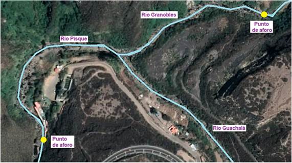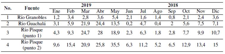 Los resultados en medidas de caudal en metros cúbicos por segundo (m3/s) de los aforos para cada mes se muestran en la Tabla 1, con una medición realizada en el río Granobles y dos en el río Pisque, en dos puntos distintos. Para el caso del río Guachará, el valor de caudal corresponde al cálculo matemático explicado anteriormente.