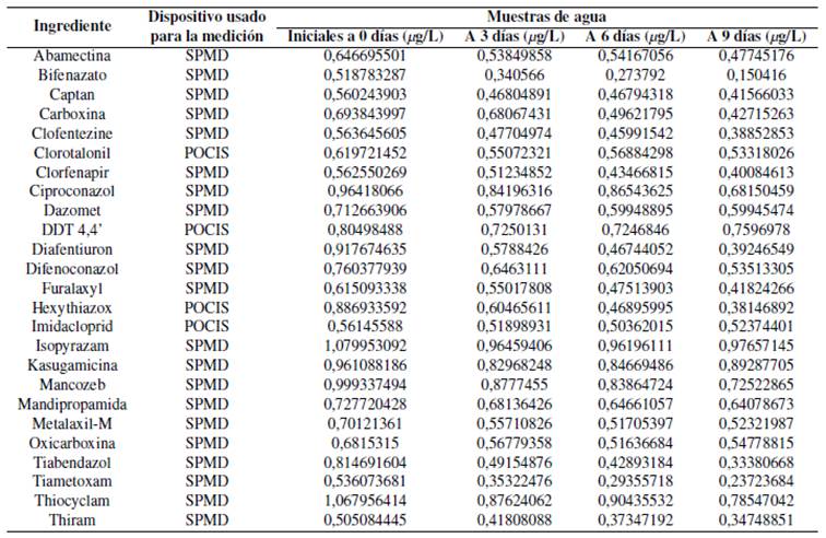 Con estos plaguicidas, se procedió a la calibración de los muestreadores pasivos SPMD y POCIS los cuales se presentan en la Tabla 2, el tipo de dispositivo de muestreo usado para su análisis según la polaridad del ingrediente, las concentraciones temporales medidas directamente en el agua luego de realizarse una mezcla del químico, y las mediciones obtenidas desde los dispositivos pasivos a los 3, 6 y 9 días.
