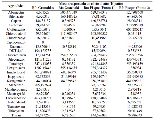 De los valores anteriores se obtuvieron las constantes de proporcionalidad con estas tasas, y los caudales mensuales se obtuvieron las cargas fluviales de plaguicidas transportadas al año en los cuatro puntos de medición, los cuales se presentan en la Tabla 3.