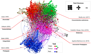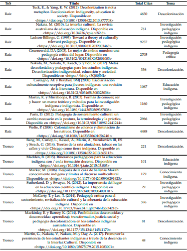 ToS también sirvió como referencia para la identificación y el análisis de los conceptos, permitiendo así la visualización de miradas pedagógicas e interculturales influenciadas por legados ancestrales de sus cosmovisiones. La Tabla 2 del anexo sintetiza el Árbol de la Ciencia generado por ToS en la herramienta Web RStudio Cloud, categorizado por área temática y el total de citas de las obras. ToS arrojo nueve (9) documentos científicos raíz, seminales, entre los cuales se destacan Tuck y Wayne Yang (2012), quienes trabajan la descolonización y la vida indígena; Nakata (20007) con la educación y el análisis de los estudiantes nativos en los procesos de educación formal para descolonizar los estudios y enfoque pedagógico indígena. Diez (10) documentos científicos del tronco, estructurales y conectores de la raíz, Entre esos autores más citados están Ladson-Billings (1995) quien trabaja la investigación pedagógica, la mejora de la educación y la investigación colaborativa y reflexiva; Gruenewald (2003) con la pedagogía crítica y la educación basada en el lugar, relaciones humanas, descolonización y la reintegración, y Wolfe (2006) con el colonialismo de colonos y la eliminación de los nativos.