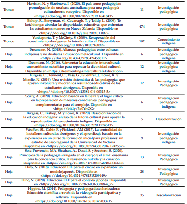 McCarty (2014) abordan la pedagogía crítica de sostenimiento y educación indígena basada en la cultura. Sutherland y Swayze (2012) la educación científica en entornos indígenas y la importancia del lugar en el contexto indígena, al igual que Madden (2015), quien trabaja la pedagogía para la descolonización, educación indígena y antirracista basada en el lugar. Diez (10) documentos científicos categorizados como Hojas o de tendencia investigativa y/o emergente esta Harrison (2020) y Dreamson (2018) y Dreamson (2016), quienes trabajan las culturas pedagógicas indígenas, educación intercultural y diversidad cultural. Higgins (2014) con la teoría descolonizaste, conocimiento y las formas de ser indígenas, lo cual abre nuevos paradigmas de educación y modelos lingüísticos (Hino, 2018; Hino, 2020). Burgess, Bishop y Lowe (2020) aportan sobre el aprendizaje profesional de los maestros desde la descolonización de la educación indígena.