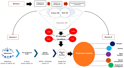 En el proceso se utilizaron técnicas bibliométricas apoyadas en Bibliometrix (Aria y Cuccurullo, 2017), Tree of Science [ToS] (Zuluaga y col., 2022; Robledo y col., 2022), análisis de redes de conocimiento por medio de Gephi (Zuluaga-Rojas y col., 2016; Blondel y col., 2008), minería de texto a partir de VOSviewer (Van Eck y Waltman, 2020) Word-Cloud (Fellows, 2018) y bitácora de revisión (Semanate-Quiñonez, Upegui-Valencia y Upequi-Valencia, 2022). La Figura 1 presenta los momentos definidos metodológicamente, las herramientas utilizadas y los productos de este estudio.