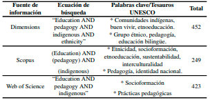 En el ejercicio de revisión se seleccionaron los documentos científicos que determinaron la comprensión de los aportes de la etno-pedagogía frente al desarrollo sustentable. La Tabla 1 presenta las fuentes de información, la ecuación de búsqueda y el total de resultados encontrados y filtrados a partir de las palabras clave y tesauro de la UNESCO (2021).