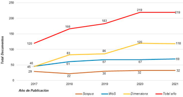 A partir de los resultados arrojados por las consultas hechas en las fuentes de información, se encontró que la indexación científica del período analizado en el tema de investigación ha incrementado. La mayoría de las publicaciones están indexadas en Dimensions con 453 documentos, seguida de WoS con 309 y Scopus con 149 documentos científicos (ver Figura 2).