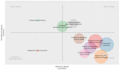 Bibliometrix, por medio de RStudio-Cloud, permitió identificar los tópicos de tendencia investigativa, sintetizados en el mapa temático de la Figura 4. Los resultados muestran que los temas y autores más citados frente a los temas de investigación son: pedagogía (Walsh, Oliveira y Candau, 2018), conocimientos autóctonos (Zurita-Álava, Murillo-Calderón y Defaz-Gallardo, 2017), integralidad (Williamson,2004; Williamson, 2005), ubicando en el centro del mapa los tópicos con más centralidad y densidad de temas. En el mismo orden se identifica un aumento del uso del concepto de diversidad (López, 1997; Zurita-Álava, Murillo-Calderón y Defaz-Gallardo, 2017) y didácticas inclusivas (Colom Cañellas,1998).