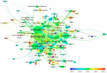Scully (2020) frente al conocimiento común de los profesores, los pueblos, las tierras y las historias para la educación indígena, y Sosa-Provencio y col. (2019) analizan la pedagogía arraigada para la construcción de una conciencia crítica y pedagogías que apoyan, involucran y mejoran los resultados educativos de los estudiantes aborígenes Burgess y col. (2019). Finalmente, para identificar clúster y tendencias en investigación, se procesaron las bases de datos en el software VOSviewer, el cual permite hacer un análisis de normalización con el método de fraccionamiento a partir del número de ocurrencias por tema y año de publicación. La Figura 6 presenta las subáreas de mayor concentración investigativa definidas por la educación, pedagogía y conocimiento frente al desarrollo sustentable, las cuales direccionan la disertación a partir de los autores seleccionados.