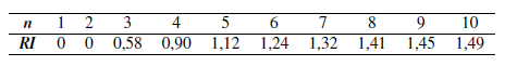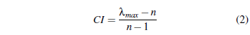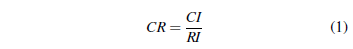 Donde, RI (Tabla 4) se refiere al índice de consistencia aleatorio; en cambio, CI se refiere al índice de consistencia descrito en la Ec (2). El