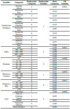 son las ponderaciones para cada una de las variables condicionantes de los deslizamientos. El modelo cartográfico LSI resultante se reclasificó en cinco clases de susceptibilidad: muy baja, baja, moderada, alta y muy alta. Estas cinco divisiones se realizaron de acuerdo al método de cuantiles, utilizando los valores de los píxeles del modelo cartográfico final de susceptibilidad a los deslizamientos.