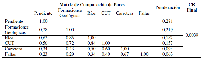El desarrollo de la jerarquización y comparación de pares permitió conocer el grado de influencia de las variables en los procesos de deslizamientos del suelo (Tabla 5). Las variables más destacadas fueron pendiente, formaciones geológicas, distancias a ríos y cobertura y uso de la tierra, mientras que las menos influyentes fueron distancias a carretera y fallas. El análisis del radio de coherencia para cada variable y para el modelo cartográfico final de susceptibilidad obtuvieron un valor inferior a 0,10 (Tabla 5 y Tabla 6). Estos valores reflejan que el procedimiento AHP fue realizado correctamente. Tras el desarrollo de la jerarquización, comparación de pares, juicios comparativos y evaluación de consistencia se obtuvo la matriz final con las ponderaciones de las seis variables para realizar el modelo final de susceptibilidad a los deslizamientos (Tabla 6).