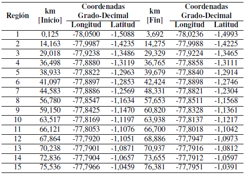 se conoció que la carretera estudiada cuenta con 15 regiones entre alta y muy alta probabilidad para la ocurrencia de deslizamientos. Estas regiones se situaron sobre zonas de alta pendiente, litología porosa y permeable, gran cantidad de ríos y suelos aptos para la agricultura. De igual forma, las regiones 1, 6, 8 y 15 se situaron cerca a los poblados de Puyo, Santa Clara, Arosemena Tola y Puerto Napo, respectivamente. Estas regiones, a pesar de su cercanía a los poblados en mención, aparentemente no representan un riesgo para los habitantes del sector.