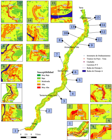 Principales regiones de la carretera Puyo-Tena con susceptibilidad alta y muy alta a los deslizamientos.