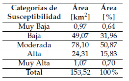 Áreas de las categorías del modelo cartográfico de susceptibilidad a los deslizamientos.