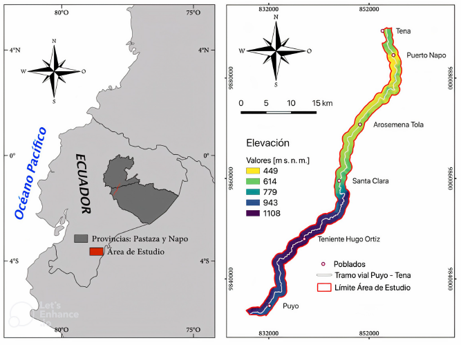 La investigación se realizó en la carretera Puyo–Tena, entre las provincias de Pastaza y Napo, en la Amazonía ecuatoriana (Figura 1). La carretera se encuentra delimitada al oeste por la Cordillera Real, al norte por el cantón Tena, al este por la Cuenca Oriente y al sur por el cantón Pastaza. Además, posee una gran variedad de geoformas como regiones montañosas, vertientes y planicies (Ministerio del Ambiente de Ecuador, 2014).
