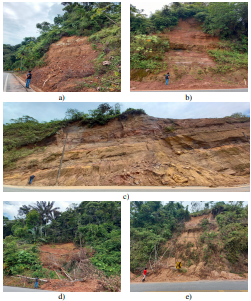 Deslizamientos de acuerdo con el inventario de la Tabla 1: a) es 1, b) es 2, c) es 4, d) es 3 y e) es 5.