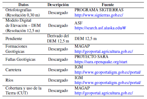 Toda la información utilizada para cumplir con el objetivo se recopiló de fuentes gubernamentales y educativas. Esta información se detalla en la Tabla 2. Se estableció que las variables a ser consideradas en la susceptibilidad a los deslizamientos fueron las formaciones geológicas, la pendiente, las fallas geológicas, la construcción de la carretera, la distancia a ríos y la cobertura y uso de la tierra (en adelante CUT). La selección de las seis variables y sus categorías se realizó en función a la información obtenida en campo y oficina. Estudios similares suscitado en la región respaldan la importancia de tomar en cuenta este tipo de variables en la realización de modelos cartográficos de susceptibilidad a los deslizamientos (Klimeš y Rios Escobar, 2010; Ortiz y Martínez-Graña, 2018; Barella, Sobreira y Zêzere, 2019; Orejuela y Toulkeridis, 2020; Vásquez, 2023). Las categorías se refieren a las distintas divisiones que tiene cada variable; por ejemplo, las formaciones Napo, Tena y Mera son categorías de la variable formaciones geológicas. Posteriormente, las variables seleccionadas fueron convertidas en capas temáticas como paso inicial en el desarrollo del modelo cartográfico de susceptibilidad.