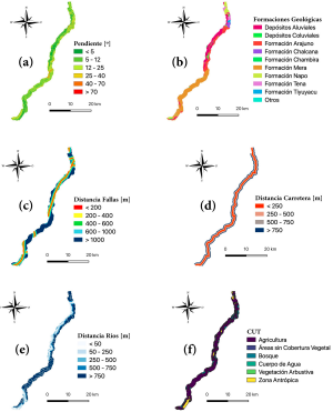 Capas temáticas de las variables a lo largo de la carretera Puyo– Tena: (a) Pendiente, (b) Formaciones Geológicas, (c) Distancia a Fallas, (d) Distancia a Carretera, (e) Distancia a Ríos y (f) CUT.