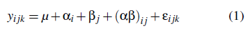 representa las observaciones correspondientes al nivel i del factor densidad y j al nivel del factor experimento; μ representa la media global;
