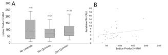Relación entre tratamientos y rendimiento. (A) tratamientos vs. índice de productividad, (B) índice de productividad vs. rendimiento.