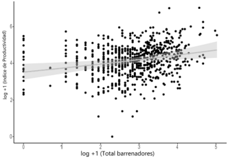 Se calculó una relación lineal positiva débil, entre el número de barrenadores (r2 = 0,047; Figura 8) y el índice de productividad calculado. Existe una tendencia donde a mayor número de barrenadores dentro de la planta, mayor productividad de esta planta. Sin embargo, se observa gran variabilidad en los resultados y algunas plantas con pocos barrenadores también tuvieron índices de productividad tan altos como plantas con muchos barrenadores. La Figura 8 muestra una pendiente ligeramente más marcada después de cierto umbral de plagas (log barrenadores=1,5); esto puede sugerir la sobre compensación inicia luego de cierto nivel de ataque.