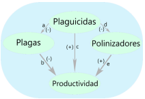 Con respecto a la relación uso de insecticidaspolinizadores (b), es por demás conocido el efecto dañino del uso de químicos sobre los polinizadores (Sánchez-Bayo and Wyckhuys, 2019). Sin embargo, para entender mucho más estos efectos se necesita profundizar en las interacciones polinizadorplanta, que para el caso de plantas de uso agrícola son altamente especializadas (Aguado et al., 2019). Esto permitirá entender mejor las relaciones ecológicas implícitas. Con respecto a la relación plaguicidas-productividad, como lo muestra Scarlato et al. (2022), el uso de pesticidas (especialmente insecticidas), no siempre tienen una relación fuerte con los rendimientos del cultivo analizado.