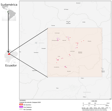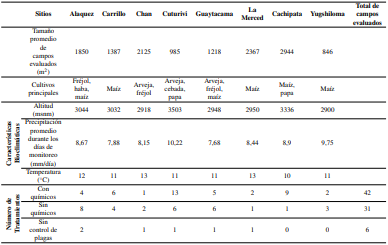 El estudio se llevó a cabo en 79 campos de agricultores, entre enero y noviembre de 2021 en la sierra centro-norte de Ecuador (Figura 2). Los campos se ubicaron en las parroquias de Alaquez, Cochapamba, Cusubamba, Eloy Alfaro, Guaytacama, Juan Montalvo, La Matriz y Pujilí (Tabla 1). Las zonas de estudio y los agricultores se eligieron por: i) niveles de intensificación en el paisaje agrícola (densidad de plantación y/o número de especies presentes en una superficie determinada); ii) prácticas agrícolas (ej. uso o no de insecticidas), iii) trabajos previos de investigación y capacitación con agricultores de la zona y, iv) interés del agricultor para participar en la investigación.