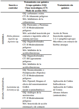 El 70 % de los agricultores que aplicaron tratamientos químicos usaron insecticidas organofosforados y piretroides, con un rango ente 1 y 4 aplicaciones antes de la etapa de floración. Por otro lado, el 95 % de los campos sin tratamiento químico usaron caldos minerales y extractos de plantas (Tabla 2).