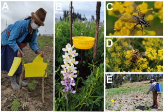 Métodos usados en este estudio (a). trampas pegantes, (b) trampas de plato, (c) mosca barrenadora ápice (Anthomyiidae/plaga), (d) Eristalis tenax (Syrphidae/polinizador), (e) agricultora aplicando tratamientos de control de plagas.