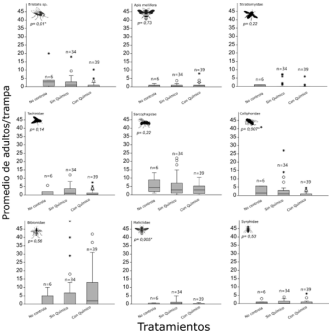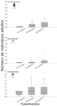 Los tratamientos aplicados muestran la variabilidad en la respuesta de las abundancias de los tres insectos plaga analizados. En los 3 casos se observa que el tratamiento sin control fue el que registró menor número de plagas. Por otro lado, para el caso de A. bourgeoisi y Agromyzidae se puede observar una ligera tendencia de una menor abundancia para el tratamiento sin químico, tendencia no observada en el caso de Anthomyiidae. Sin embargo, estadísticamente, no se han encontrado efectos significativos de los tratamientos sobre la abundancia de las tres plagas (p >0,05, Figura 4).