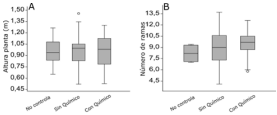 Relación entre los tratamientos y las medidas de daño por plagas barrenadoras. (A) Altura de planta en m, (B) Número de ramas.