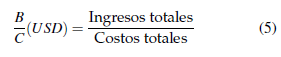 Para calcular esta relación se realiza la suma de los ingresos totales de la producción agrícola con riego para 10 años dividida para los costos totales de la inversión del sistema de riego y de la implementación del cultivo según la ecuación 5.