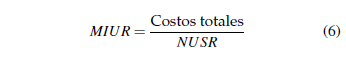 Este monto se determina considerando los costos totales de la inversión del sistema de riego en relación con el número de usuarios del sistema de riego según la ecuación 6. Siendo: MIUR = Monto en dólares de inversión por usuario de riego; NUSR= número de usuarios del sistema de riego.