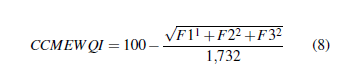 Fundamentado en el modelo conceptual del índice de calidad del agua del Consejo Canadiense de Ministros de Medio Ambiente (CCMEWQI); su cálculo se obtiene aplicando la ecuación 8. El alcance (F1) expresa el porcentaje de parámetros que no cumplen con los niveles deseables (límites máximos permitidos) respecto al total de parámetros. La frecuencia (F2) se obtiene por la relación entre el número de resultados que no cumplieron con los niveles deseables respecto al total de resultados. La amplitud (F3) es una medida de la desviación que existe en los datos, determinada por la magnitud.