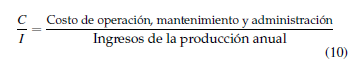 Para calcular esta relación se realiza primero la suma de los costos totales anuales en operación, mantenimiento y administración dividida para los ingresos netos de la producción anual como se detalla en la ecuación 10.