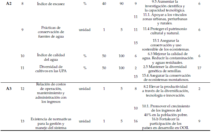 Además del análisis interno de los sistemas de riego, resulta fundamental vincular los indicadores definidos con marcos de referencia globales que orientan la sostenibilidad. Esta integración permite evaluar no solo el desempeño local, sino también la contribución de estos sistemas al cumplimiento de los compromisos internacionales (Tabla 3). En cuanto a los atributos del MESMIS, a continuación se describen los indicadores que corresponden a cada uno de ellos.