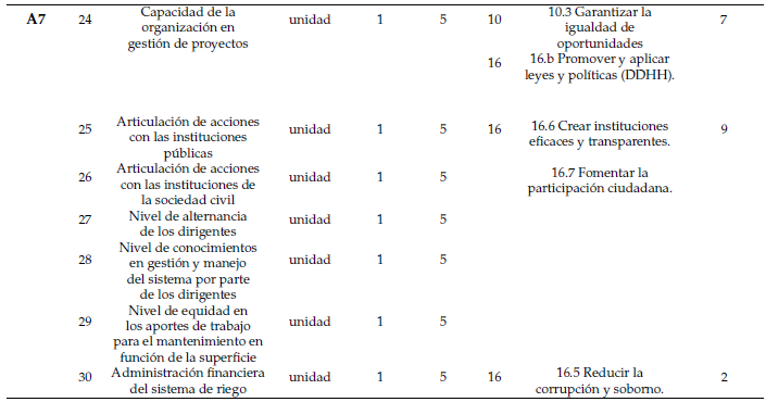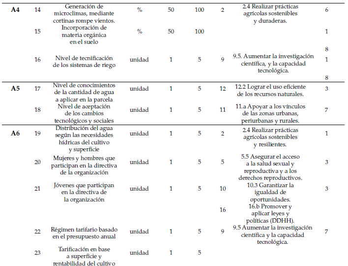 La vinculación de los indicadores con 10 ODS y 7 Principios CSA-IRA (Garcés and Padilla, 2020; FAO, 2014) refuerza el aporte estratégico de estos sistemas de riego al desarrollo sostenible. La propuesta metodológica ofrece así una herramienta operativa para evaluar e intervenir los sistemas de riego comunitarios desde una perspectiva holística, dinámica y localizada (Pérez-Serrano et al., 2021).