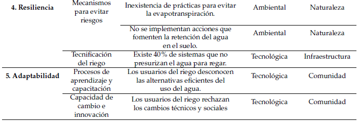 Este atributo evalúa la capacidad del sistema de riego para aplicar medidas que reduzcan los riesgos y fortalezcan su resistencia frente al cambio climático en contextos agrícolas (Ward, 2022). En la dimensión ambiental, se identificaron dos puntos críticos: la falta de prácticas para reducir la evapotranspiración y la ausencia de acciones que favorezcan la retención de agua en el suelo. En la dimensión tecnológica se detectó un punto crítico relacionado con el bajo nivel de tecnificación del riego.