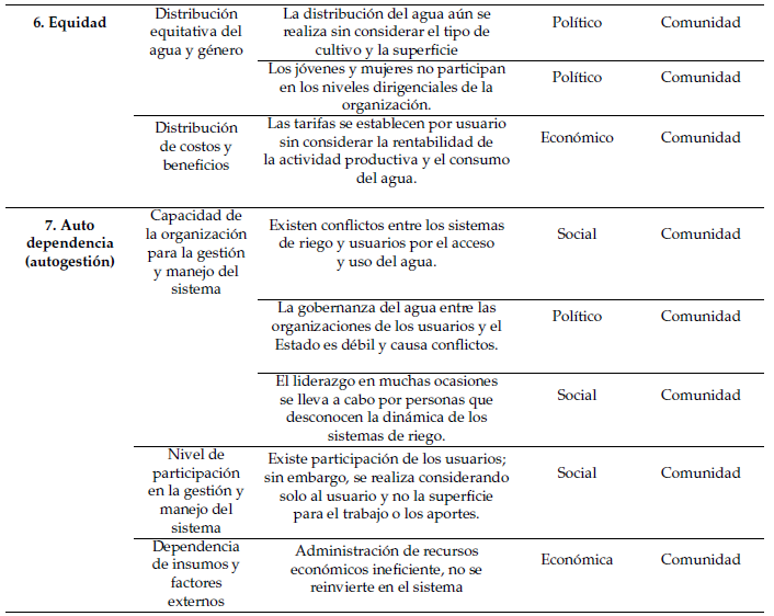 El subsistema comunidad abarca las acciones humanas que, a nivel individual, comunitario o colectivo, impactan la eficiencia física, económica, social y ambiental en el uso del agua agrícola. La gestión del agua en los sistemas de riego implica llevar a cabo procedimientos específicos para acceder, conducir, almacenar, distribuir y aplicar el agua de manera eficiente, minimizando desperdicios. Se identificaron cuatro factores principales en este subsistema: i) Conocimiento: Relacionado con el grado de comprensión de los usuarios, ya sea de forma individual o comunitaria, respecto al tiempo de riego óptimo según el tipo de cultivo; ii) Participación social: Incluye la implicación de los usuarios en actividades comunitarias, procesos de toma de decisiones y programas de capacitación y formación; iii) Institucional: Referente a la capacidad de la organización para operar, mantener y administrar el sistema, se consideran también otros aspectos como la gestión de turnos de agua, alternabilidad en los liderazgos y tipo de organización; iv) Económico: Incluye la capacidad financiera de los usuarios y organizaciones para acceder al financiamiento, mantener y renovar el sistema, así como la existencia de políticas que respalden estas actividades.