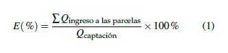Para calcular la eficiencia se considera la sumatoria de los caudales de las parcelas bajo riego dividido para el caudal de ingreso en la bocatoma y se expresa en porcentaje en la ecuación 1.
