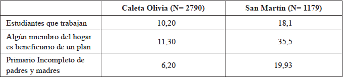 La Tabla Nº 1 expresa que los estudiantes de San Martín son quienes más trabajan (18.1%) comparativamente con los de Caleta Olivia (10.2%), aunque son en ambos lugares una proporción grande de jóvenes estudiantes que tienen algún empleo. También, nos hemos encontrado con que las familias de los estudiantes en estos barrios de ambas áreas han vivido y viven en gran medida por los subsidios o la ayuda social del Estado, trabajos ocasionales en el sector informal y las redes de intercambio social (Segura, 2006). Por último, una gran parte de las familias de los jóvenes no poseen la mínima educación, con mucho más fuerza en San Martín que la que se presenta en Caleta Olivia. Un supuesto de esta diferenciación es que los flujos poblacionales de ambas áreas tienen características distintas en cuanto a su composición educativa y en cuanto a sus objetivos laborales. Pero tanto en Caleta Olivia como en San Martín, la población migra en búsqueda de mejores oportunidades laborales, de vivienda, alimentarias y, por supuesto, también, de educación.