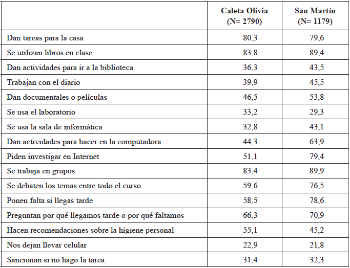 Luego de sucesivas reformas educativas formales6 y de aquello que se expresa en la cotidianeidad escolar frente a las condiciones de vida que presentan los estudiantes, lo que mayormente sucede tanto en Santa Cruz como en San Martín para los estudiantes, a partir de la Tabla Nº 2, es que se dan tareas para la casa (80.3% y 79.6%, respectivamente), utilizan libros (83.8 % y 89.4 %, respectivamente) y trabajan en grupos (83.4% y 89,9%, respectivamente). La diferencia entre ambas áreas, es que para los estudiantes de San Martín, hay muchas otras cosas que suceden tal como investigar en internet (79.4%) y debatir los temas entre todo el curso (76.5%) con tanta fuerza como aquellas que nombramos en primer lugar. No sucede así con los estudiantes de Santa Cruz.