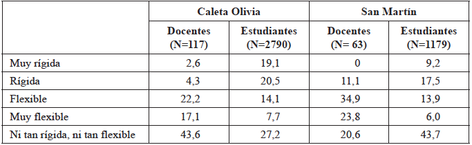 La primera y principal lectura que surge de la Tabla Nº 3 es que hay tensiones considerables entre las prácticas discursivas de los jóvenes por un lado y las de los adultos por el otro, en ambas áreas: a) Hay porcentajes considerablemente más significativos de los jóvenes para las respuestas que hacen referencia al régimen disciplinario como rígido y muy rígido en comparación a los adultos. b) Los porcentajes ascienden lentamente de estudiantes hacia docentes cuando la respuesta es régimen disciplinario flexible. c) Los porcentajes son considerablemente más significativos de las respuestas de docentes acerca de un régimen disciplinario demasiado flexible con respecto a las respuestas de estudiantes. Sucede una distinción para ambas áreas que tiene que ver con la respuesta “ni tan rígida, ni tan flexible”. Los jóvenes en San Martín parecerían darse cuenta en mayor medida que sus pares de Santa Cruz de los vaivenes y sinsentidos que, muchas veces, las normativas tienen en la producción de la escolaridad. A su vez, al revés sucede con los docentes. Son en Santa Cruz8 quienes en mayor medida que sus pares de San Martín dan cuenta de esta situación de fragilidad, inestabilidad e incertidumbre en el sistema educativo en relación a las normas y a su puesta en funcionamiento.