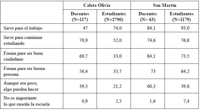 De esta tabla, nos damos cuenta que los jóvenes esperan en mayor proporción que los adultos que la escuela los forme para el trabajo, tanto en Santa Cruz como en San Martín. A la inversa, los docentes esperan en mayor proporción que los estudiantes que la escuela forme para ser buenos ciudadanos y buenas personas, en ambas áreas. En cambio, suceden tendencias diferentes en cuanto a la justificación de que sirve para continuar estudios posteriores. En Santa Cruz, en mayor medida son los docentes quienes dicen eso y en San Martín, son los estudiantes.