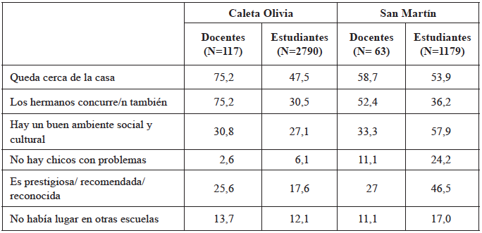 Acá hay fuertes diferencias entre adultos y jóvenes en las escuelas tanto de Santa Cruz como de San Martín, aunque con tendencias opuestas en algunos casos. Para docentes de ambas áreas, en mayor medida las razones principales de asistencia a la escuela de los estudiantes tienen que ver con la cercanía así como con que sus hermanos concurren allí. En cambio para los estudiantes que concurren a escuelas en San Martín, la razón principal es que haya buen ambiente social y cultural (57,9%) y para los estudiantes que concurren a escuelas en Santa Cruz, si bien es que les queda cerca (47,5%) ello aparece más matizado y con menos fuerza porque no hay tanta distancia entre ese porcentaje y el resto de las justificaciones, como también sucede con los estudiantes en San Martín. Es significativo el porcentaje que aparece en los estudiantes de San Martín que dicen que asisten allí porque es prestigiosa, recomendada y reconocida con el 46.5%. Con ello se podría pensar que los jóvenes en contextos de pobreza urbana si bien no eligen en un primer momento la escuela a la que van, cuando ya están allí sí lo hacen por aquello que la escuela es y por aquello que allí viven. Ellos apuestan, desde formas diversas y con diferentes maneras de expresión, por su escuela. No asisten porque sí y tienen sus razones de por qué es importante concurrir ya que les va a servir de alguna u otra forma para sus vidas.