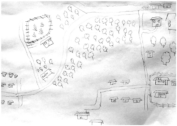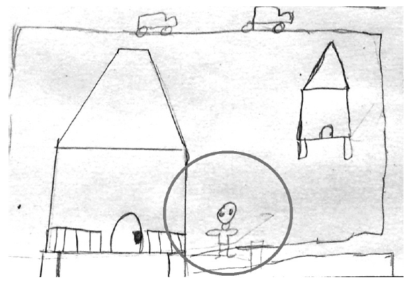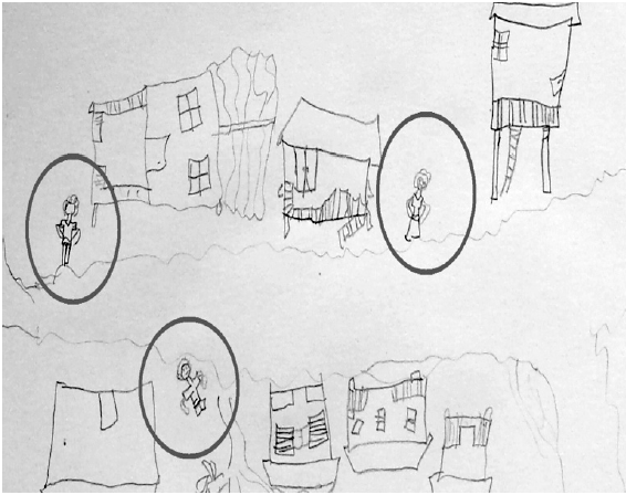 En el dibujo de Ámbar, a diferencia de los demás, no sé graficaron personas, es como si viviera en un pueblo fantasma donde las personas están ocultas en sus casas, otros trabajando (talleres), unos en la escuela, y otros en el subcentro de salud. En una conversación informal con un habitante del Limbo nos decía “aquí todos nos conocemos, pero no nos comunicamos”, esto en complementariedad con el dibujo de Ámbar da cuenta de una fragilización del vínculo social en la localidad.