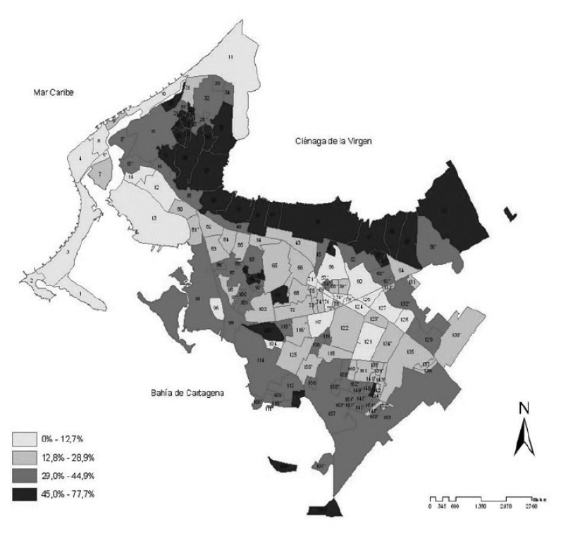 La interseccionalidad de este problema se sustenta en la hipótesis que tanto la pobreza, la segregación socio-espacial y la violencia que se presenta en la ciudad tiene raíces estructurales vinculadas con la construcción histórica de lo que se puede llamar como un: Estado racial (Goldberg, 2002), el cual a su vez ha producido y reproducido una ciudadanía precaria, especialmente para las minorías, debilitando su acceso al capital económico en relación con las ciudadanías hegemónicas (blanco/mestiza), que en el caso de Cartagena se ha concentrado: social, material y simbólicamente en los espacios con mejores condiciones urbanísticas, proyección financiera, turística e inmobiliaria. Esto es un proceso que viene siendo planificado desde los años 70, creando de este modo las condiciones materiales y políticas para desplazar y segregar paulatinamente a la población afrodescendiente a las periferias de la ciudad, proceso que he definido como: violencia estructural (Galtung, 1969).