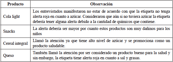 Al ser consultados sobre si algún producto le había sorprendido por su etiqueta, los entrevistados manifestaron una serie de productos que se detallan en la siguiente tabla:
