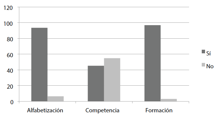 Para dar respuesta a este objetivo, se realizaron varias preguntas al profesorado respecto al conocimiento que poseen sobre el término alfabetización, el término competencia mediática y la necesidad de formación del docente para el uso de las TIC en el aula (Figura 1).