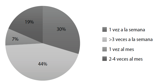 Tal y como se observa en la Figura 2, un 29,6% utiliza las TIC una vez a la semana; El 44,4% más de tres veces a la semana; El 7,4% la utilizan una vez al mes; Y el 18,5% hace uso de las TIC más de una vez al menos y menos de 4 veces.