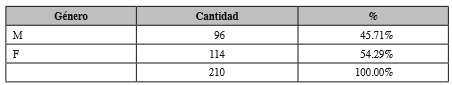 El promedio general de edad de los estudiantes es 23 años. La cantidad de estudiantes de género masculino es 96, esto representa el 45.71% y de género femenino es 114, esto representa el 54.29%, tal como se detalla en la siguiente tabla.